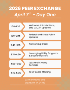 The Association of Energy Conservation Professionals (AECP) will be hosting the next Peer Exchange on April 7-8 at the Wytheville Meeting Center.