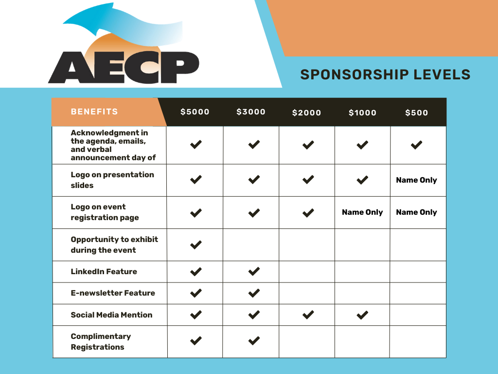 We also invite you to join us as a 2026 Peer Exchange Sponsor to help make this important industry event possible. Sponsors receive exposure before, during, and after the event, as well as opportunities to network and select complimentary registrations. Sponsorship levels and benefits are pictured below. For more information or to become a sponsor, please email us at info@aecpes.org.